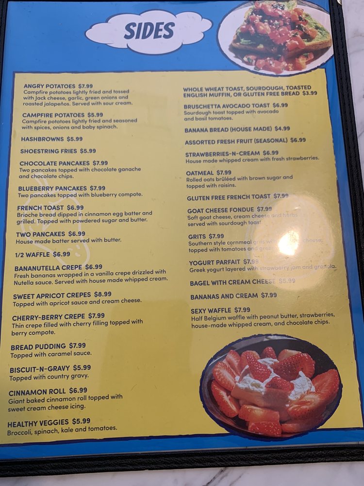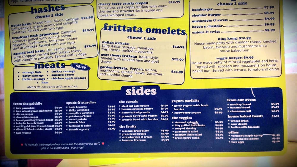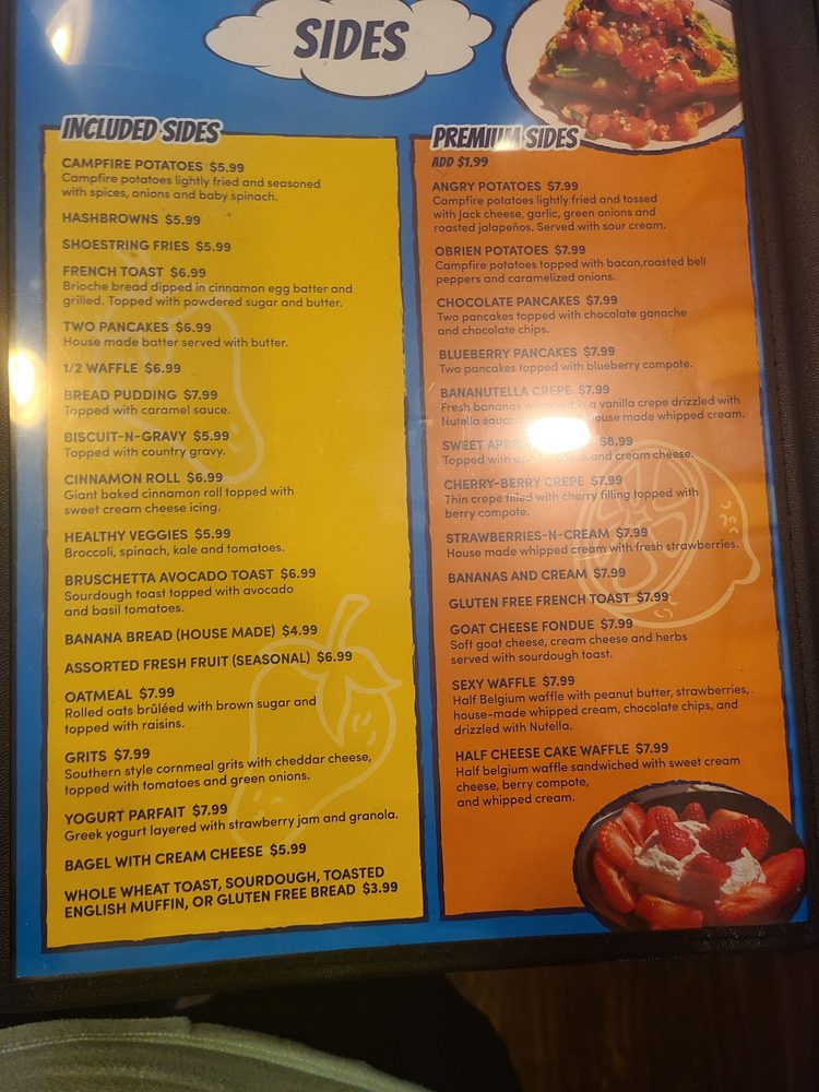 Campfire potatoes, ham, bacon, sausage, onions and peppers. Topped with cheddar cheese and scrambled eggs. Includes 1 side.